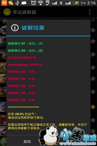 这个过程,你得稍微等待一下。点击“应用”以后,程序会自动进行修改,根据被修改的游戏体积和你的设备性能的不同,此过程将消耗30秒到2分钟不等,请耐心等待。修改完之后会弹出下图所示图片,一般情况下只要运气不是0%,都是可以成功修改的,赶快点击“启动”试试吧,一般上都是成功了。