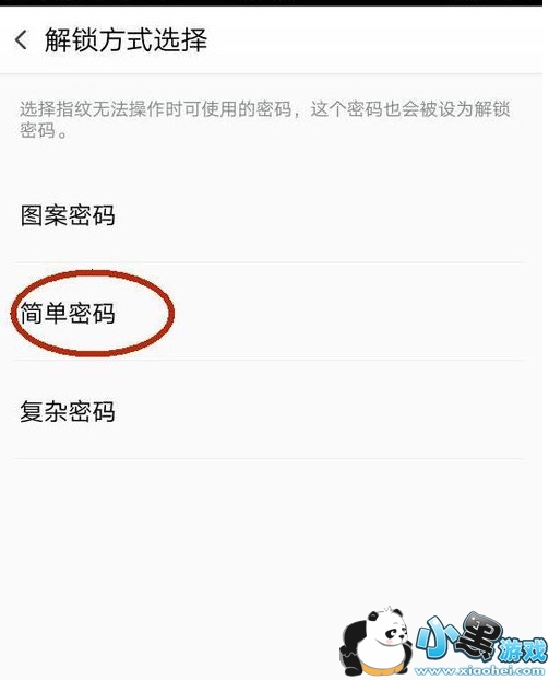 4、点击打开解锁后面的开关以后点击解锁进入到解锁方式选择窗口,在解锁方式选择窗口上面点击选择简单密码,因为天有不测风云,想小编这种得了手残症的人得不到公司打卡机承认的人,指纹识别不了是很有可能发生的所以有备无患总是好的