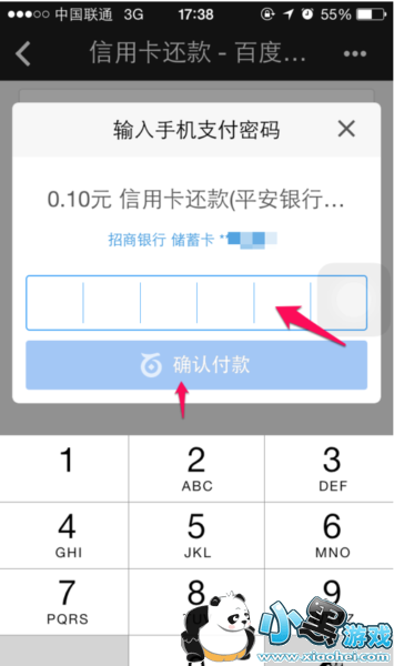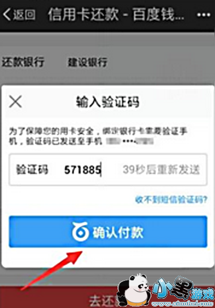 第六:百度钱包就会自动选择绑定的银行储蓄卡进行信用卡还款,然后输入百度钱包的支付密码,再点击“确认付款”。