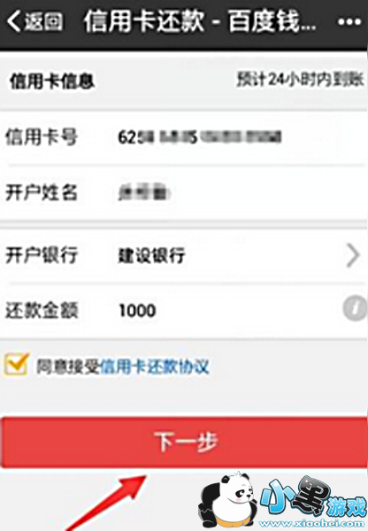 第四:然后到了信用卡还款页面,输入信用卡卡号和自己的姓名,还有还款的金额,完毕后点击“下一步”。