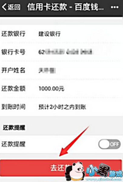 第五:接着会显示相应的还款信息和预估到账时间,你可以根据自己情况设置还款提醒,然后再点击下面的“去还款”按钮。