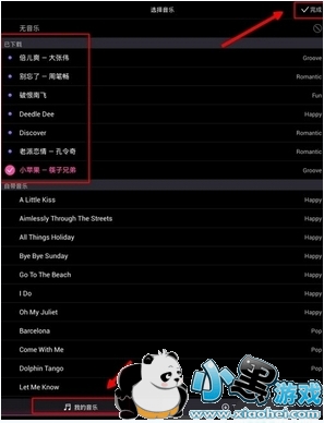 第四步:下载完成后再点击左边“我的音乐”此时就可以看到下载好的音乐在前排了,“勾选”音乐试听后再从右上角点击“完成”。