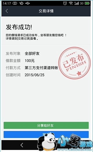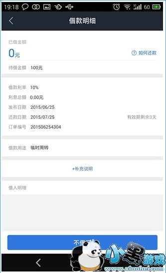2、点击“提交”,输入交易密码,进入下一步,显示交易详情,借款请求就成功发布了。有意思的是,请求发布出去后,在收到出借人的借款之前,可以取消已经发布的借款请求。只要在主页面中,点击借款信息进入借款明细,页面下方有一个“不借了”按钮,点击确定即可取消借款请求,如下图所示: