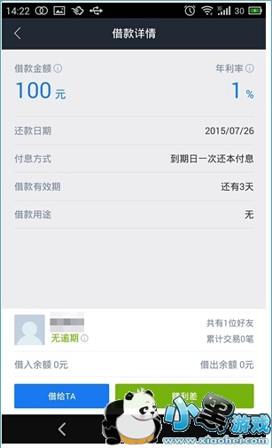 3、小编发布请求之后,另外两位位好友的主页面中会显示小编的借款信息,如果想要出借,可以点击进去查看更详细的借款信息,包括清风小编的用户名、还款日期、有无逾期等,点击“借给TA”,输入借出金额,(这里借贷宝会自动计算出到期所得收益),点击“转账”选择转账方式,系统会自动发送一个短息验证码到 手机中,输入验证码并提交后完成出借,资金即从出借人账户转至借款人账户,具体操作如下图所示: