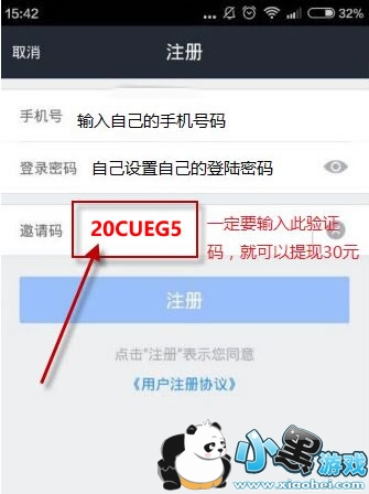 2、软件下载成功后,接下来就是注册用户,输入邀请码:20CUEG5(请一定要输入此邀请码,为什么?因为该验证码是官网最高级别的邀请码,可以提现30元,有的不是最高级别的邀请码只能提现20元,小编亲测后的结果)。