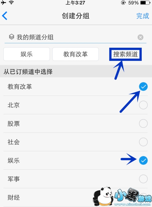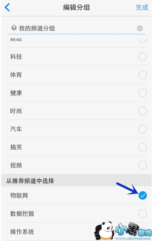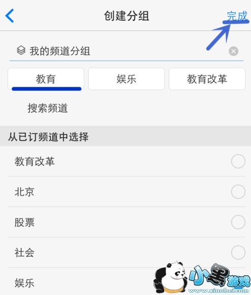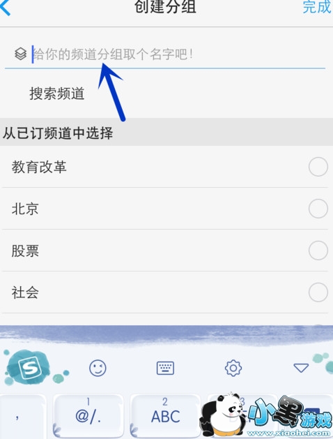 搜索添加新频道。输入想要搜索的词,点击键盘右下角“搜索”,按“+”添加,新的频道就出现在了新分组里,点击“完成”。
