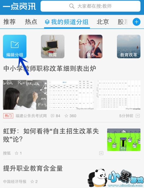 添加推荐频道。在资讯页面出现了新建的频道分组,点击“编辑分组”。下拉,就可以从“推荐频道”中添加频道到分组中了