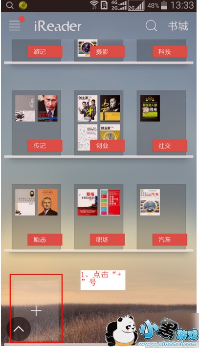 首先打开手机上的Iread软件(首先你要在你的手机上安装app软件 ireader),然后找到我的书架,然后把手机屏幕拉倒最下方,点击页面中的"+"号。