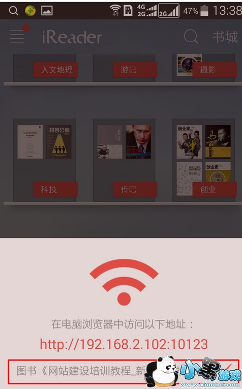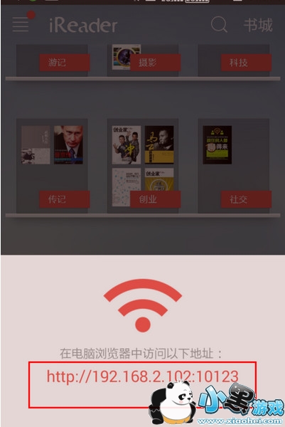 将手机页面出现的IP地址,填入到电脑浏览器地址栏当中,浏览器窗口会出现iReader的界面。