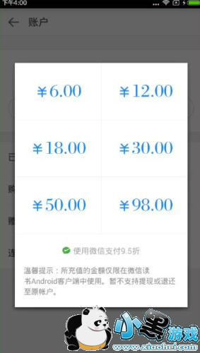 第四步:用微信支付可以享受9.5折,也还是不错的,毕竟充的多省的也多,点击立即支付即可开始畅读。