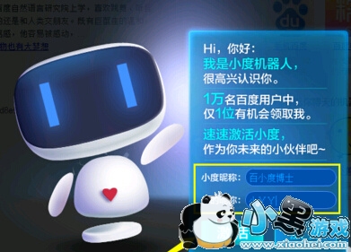 2、播放完成后,弹出“百小度激活领养”对话框,按照提示输入“百小度”的昵称,再输入“自己的昵称”,点击“激活”按钮,即可完成领养。