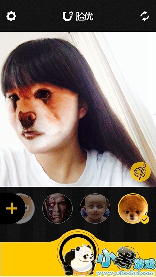 首先打开软件进入首页,其实首页就是拍照界面啦!可以看到下方有一排的“脸”供你选择呢,小编就选择“狗狗脸”做个示范吧!