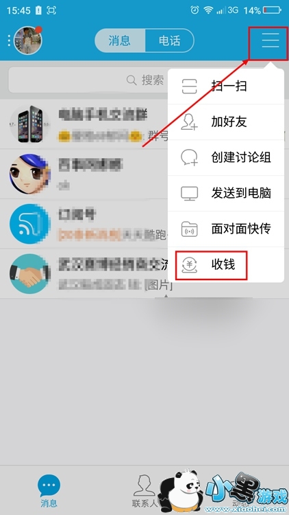 1、首先打开手机QQ,点击右上角箭头所指的位置,并点击收钱。