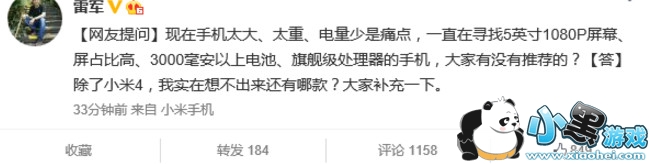 当然,雷军昨晚的一条微博,似乎也能够看出一些端倪。昨晚,雷军曾在微博上自问自答,称“一直在寻找5英寸1080P屏幕、屏占比高、3000毫安以上电池、旗舰级处理器的手机,大家有没有推荐的?【答】除了小米4,我实在想不出来还有哪款?大家补充一下。”