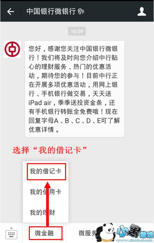 关注成功后微信会自动收到一条该公众号发来的欢迎信息,点击对话窗口下面的“微金融”,然后选择“我的借记卡”