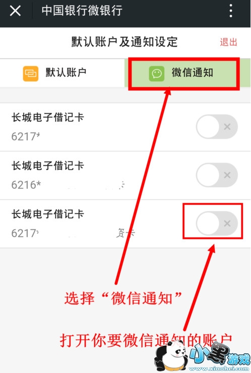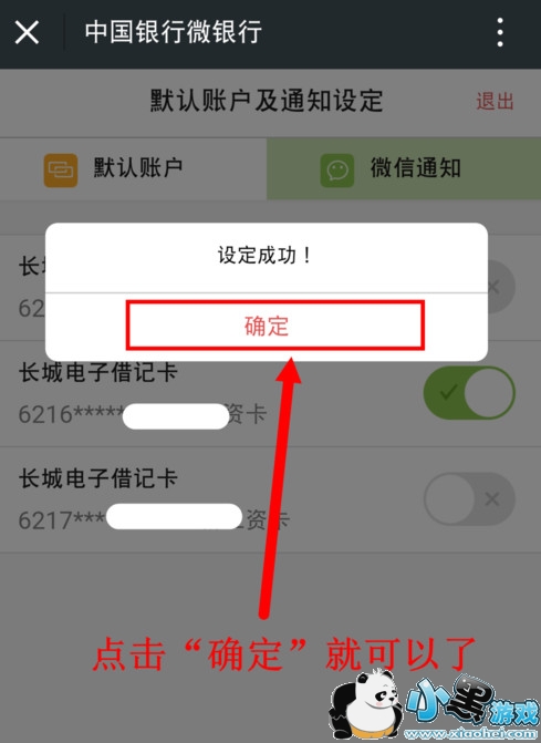 在进入的界面中先切换到“微信通知”一栏,下面就是你的网银账户列表,每个银行卡账户后面均有一个开关按钮,点击该开关即可打开该银行卡的微信提醒功能,打开时会有“设定成功”的对话框,点击“确定”即可。
