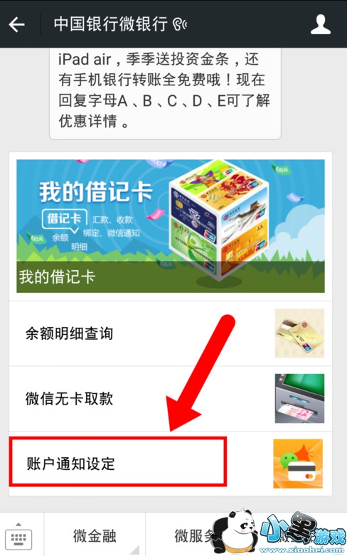 然后又会收到该公众号发来的一条反馈信息,我们选择最下面的“账户通知设定”。