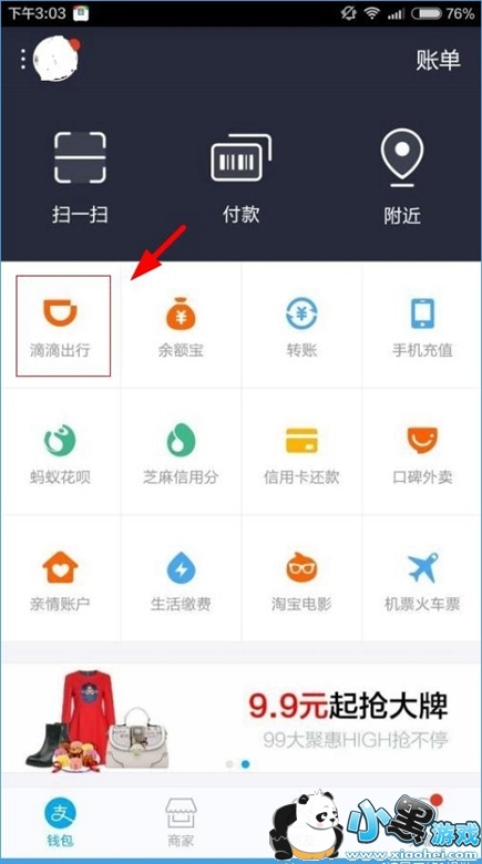 1、利用支付宝付款(打开支付宝界面,进入滴滴出行)