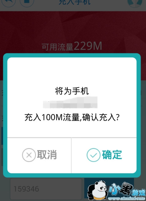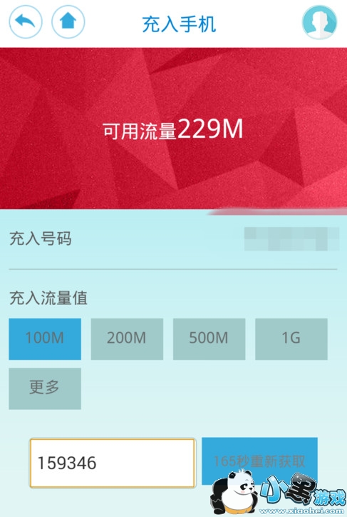 点击“充入手机”后我们在这个页面选择充值额度,刚刚也说了最低充值额度100M,然后大家可以在这下面选择,还可以点击更多来选择更多。选择完成我们需要获取一个验证码,最后点击下面的确定按钮进行充值操作。