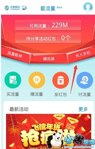 首先我们打开爱流量右侧找到“充入手机”的字样,大家要记住最低的充值额度是100M哦~