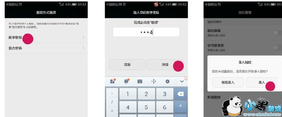 在“数字密码”或“混合密码”中选择一种解锁方式,然后输入你的密码。假定选择“数字密码”,然后将密码设置为:1234,点击“继续”,然后点击“录入”。