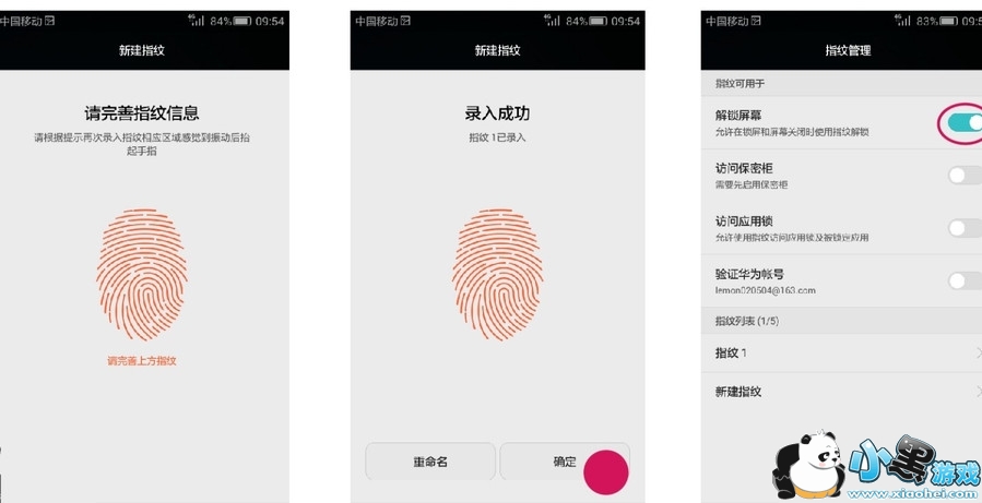 根据屏幕提示,完善指纹信息,然后点击“确定”。“解锁屏幕”的开关亮起后,就说明指纹录入成功啦。