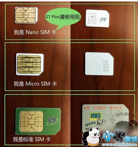 由于 G7 Plus 仅支持 Nano SIM 卡,所以,您需前往运营商的营业厅办理标准规格的 Nano SIM 卡(注意:剪卡会对手机造成损伤,本手机不支持任何形式的剪卡哦)。目前,市面上 SIM 卡有 3 种规格: 标准 SIM 卡、Micro SIM 卡以及 Nano SIM 卡,这三种卡的区分请参考下图: