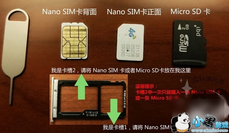 将卡托上装上两张 Nano SIM 卡,或者一张 Nano SIM 卡和一张 Micro SD 卡。
