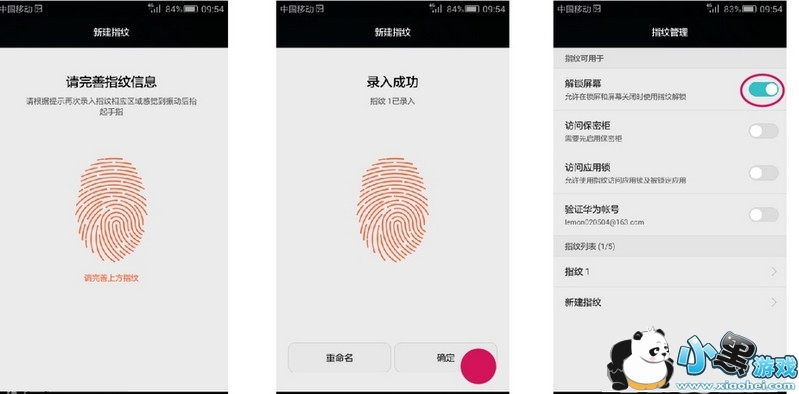 根据屏幕提示,完善指纹信息,然后点击“确定”。“解锁屏幕”的开关亮起后,就说明指纹录入成功啦。