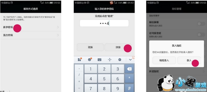 在“数字密码”或“混合密码”中选择一种解锁方式,然后输入你的密码。假定选择“数字密码”,然后将密码设置为:1234,点击“继续”,然后点击“录入”。点击“录入”后,就可以准备录入指纹了。