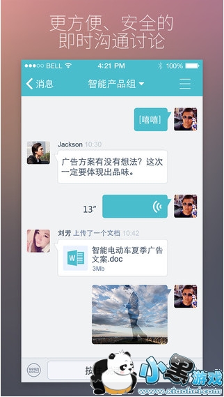 可以发送文字消息、图片、视频、互传文档给对方 ,还可以轻松创建讨论组。除此之外,还可以安排会议日程、召开电话与网络视频会议。可以通过讨论组发起文字、语音消息、图片或视频,甚至传送档案给多人。在讨论中如果觉得还是不够有效率,可以立即安排会议。