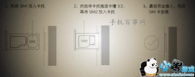 2、然后将卡托推进卡槽1/2,再将 SIM1 放入卡托;