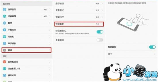 首先,想要进行指关节截屏操作,先要打开智能截屏功能。进入设置界面,点击智能辅助下的更多,将“智能截屏”功能开启。好了,这时候就可以使用指关节截屏了。