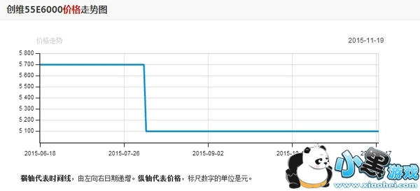 创维55e6000电视机2015年3月出厂,一直广受消费者关注,价格比较平稳,维持在5700元,一直到2015年的8月初降了一个点,价格只要5100元了,下面请看创维55e6000价格走势图:
