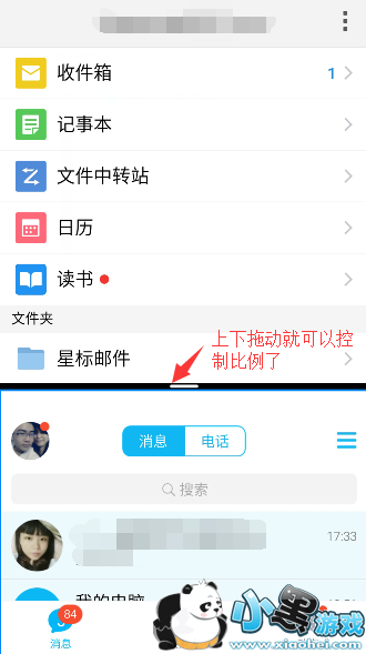 是不是很简单呢,那么魅族flyme5分屏模式怎么控制窗口比例,这个也十分的简单,用户选好要分屏的两个应用后,在两个应用的交接处有一个稍微宽一点的细线,上下拖动,就可以控制两个应用的大小了,如下图: