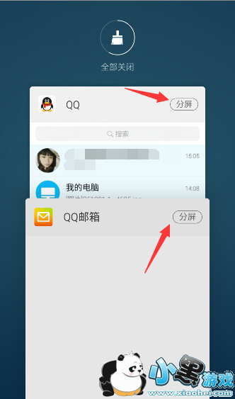 其实很简单,玩家只要在手机的屏幕下边往上滑动一下,调出多任务窗口,然后在多任务的中各个任务的右上角就可以看到一个分屏功能,如图: