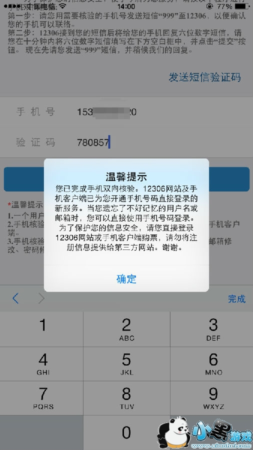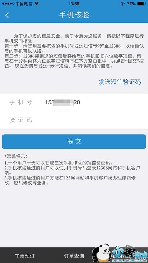 这个时候用手机向12306发送短信“999”。随后12306会回复一个6位数字的短信到该手机上。新用户需在10分钟之内,输入这6位数字的验证码,从而登录12306网站。