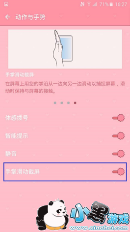 将手掌滑动截屏功能设置为开启状态。需注意的是,手掌滑动的时候需保持与屏幕的接触。
