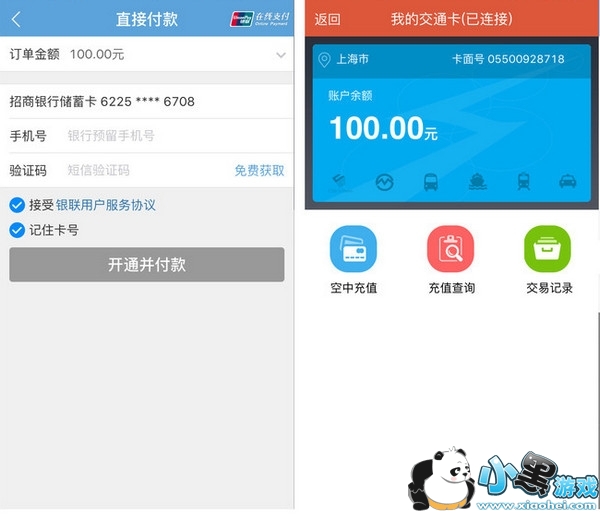 激活之后就可以给手环进行充值了,充值的金额最低为100元,最高为500元,选择好相应的金额之后,进入支付页面,这里只需填入银行卡号和手机收到的验证码即可,不会让用户输入取款密码。