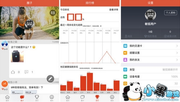 APP的最下方分别有首页、圈子、排行、以及我的这四个选项,点击“圈子”可以看到其他敏狐嘀嘀手环用户对于手环使用或者心得的一些分享。“排行”则能看到你一周内的运动量曲线图以及各地区敏狐用户的运动量。最后一个“我的”则是一些常规的设置以及电量显示。