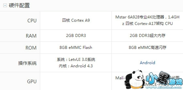 乐视s50搭载 Mstar1.5GHz 6A918 四核 CPU;Mali450 四核 GPU是现今最新且最成熟的电视芯片解决方案。强劲运算能力,轻松运行3d游戏、高清视频等。全面优化画面,减少影像拖尾、提高画面细节。