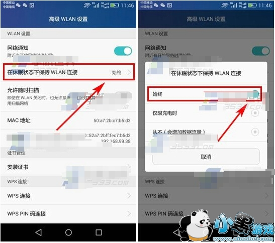 2)接着我们再点击【在休眠状态下保持WLAN连接】,最后再点击【始终】即可。(PS:如果不是连接wifi的情况下也是如此,请查看上面的相关教程把锁屏通知打开即可)