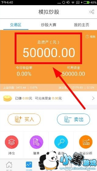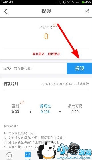 当然这五万的炒股本金肯定不是现实中的人们币,它是指五万个模拟炒股的金币,用户可以使用这个进行股市上的买卖活动。当然这个金币也不是完全没有价值的,当你赚取一定数量的金币之后是可以按照比例进行提现的,如下图所示: