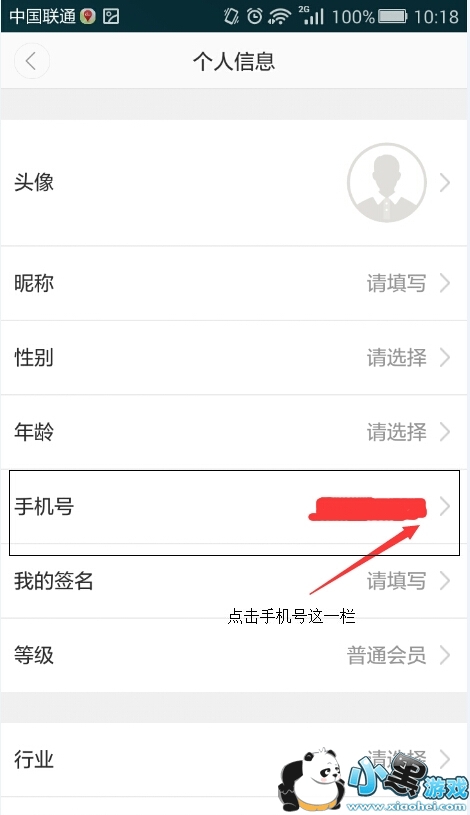 第三步:进入个人信息界面,点击手机号这一栏有灰色箭头的地方,如下图: