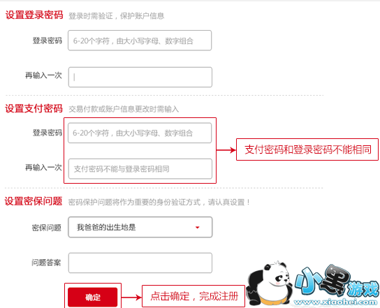 3.之后会让你设置登陆密码和支付密码,注意两个密码一定不要一致哦;最后一步设置安全问题,这样就注册成功了。