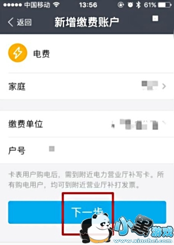 第七步:接下来,您需要输入新增缴费账户的信息,包括家庭、缴费单位、户名等等,然后点击下一步;