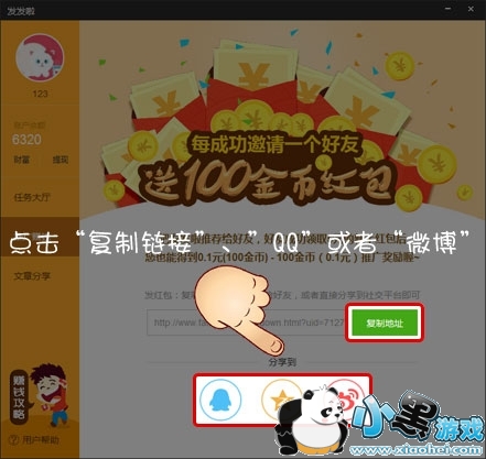1、将带有自己ID的推广链接分享给朋友,您的朋友通过链接下载并安装发发啦后,将成为发发啦的用户并获得5元的新人红包。每成功邀请一位好友您将获得100金币的推广奖励。