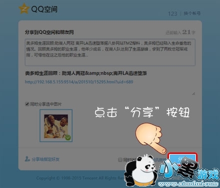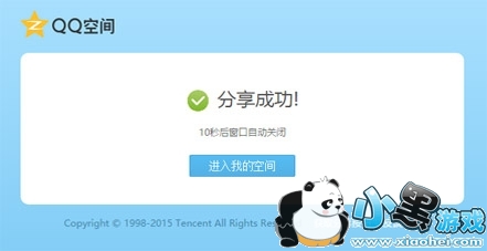 第三步:(以分享到QQ空间为例)点击分享到QQ空间按钮之后会弹出QQ空间的分享页面,点击“分享”按钮,弹出“分享成功”界面,完成。