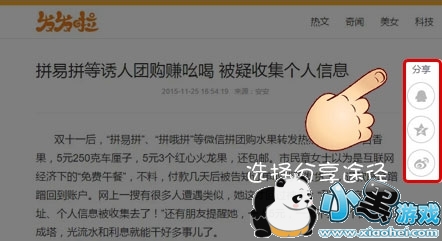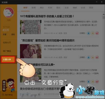 1、选择您喜欢的文章,分享到QQ、QQ空间或新浪微博等社交平台,有朋友阅读您的文章,您将会获得收益,每次阅读奖励10金币。(小提示:如果您分享的文章被您的朋友分享了,他的好友里产生的点击,也算进您的收入里。)
