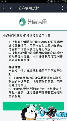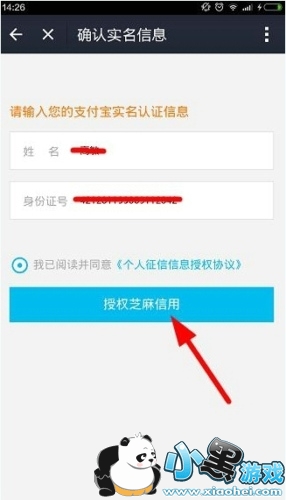 第三步:进入如下界面,然后填上您的姓名与身份证号,点击“授权芝麻信用”;
